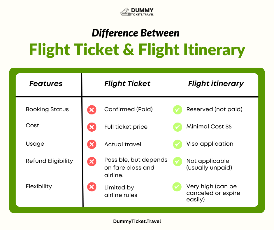 It’s easy to confuse a flight itinerary with a flight ticket, but embassies and consulates distinguish between the two. Here’s a comparison to clarify: