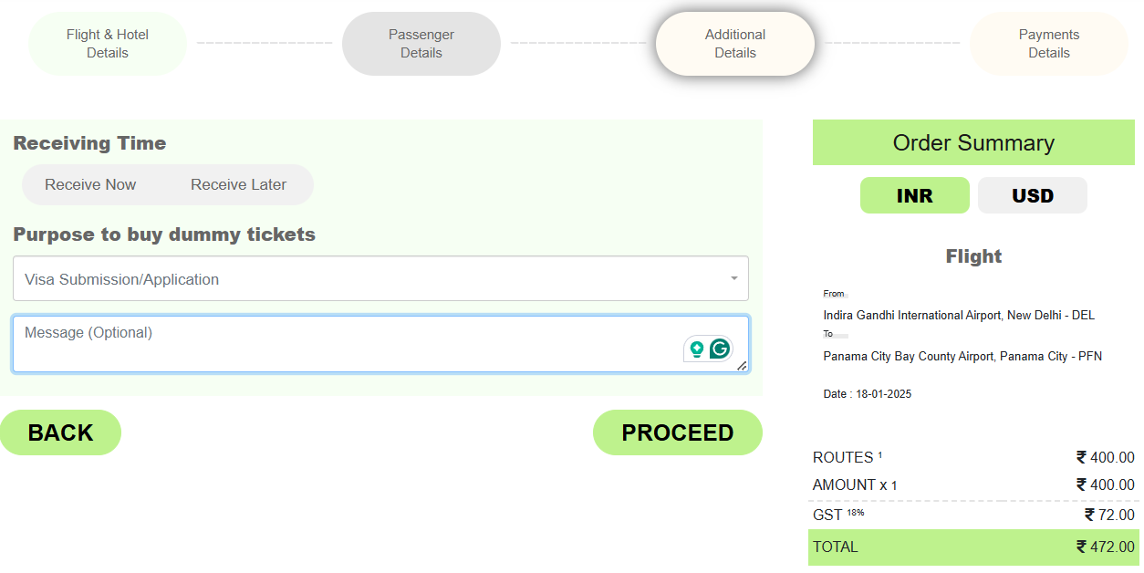 Step 4: Select the purpose of purchasing a flight itinerary for your visa application process. It is necessary to tell your purpose. Also, there is an option to click on receive dummy ticket now,” and then your ticket is in your hand within 30 to 60 minutes. Or if you choose to receive it later, then you also have the option to receive your dummy flight ticket later, just before the day of your visa application process, or whenever you want.
